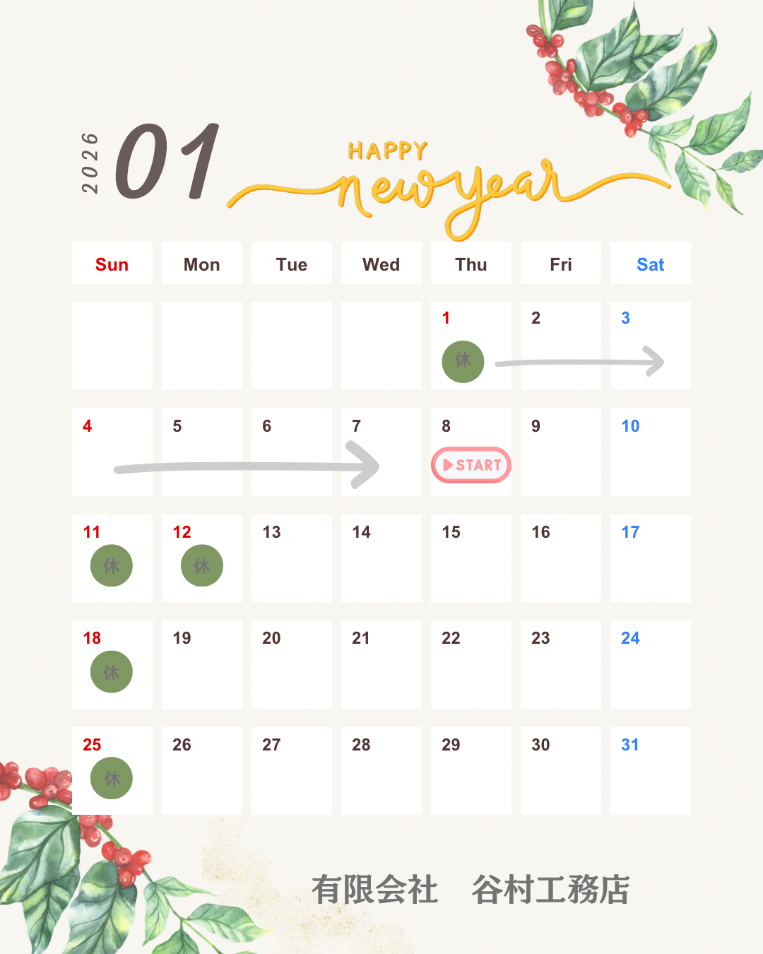 【お知らせ】2026年1月の定休日